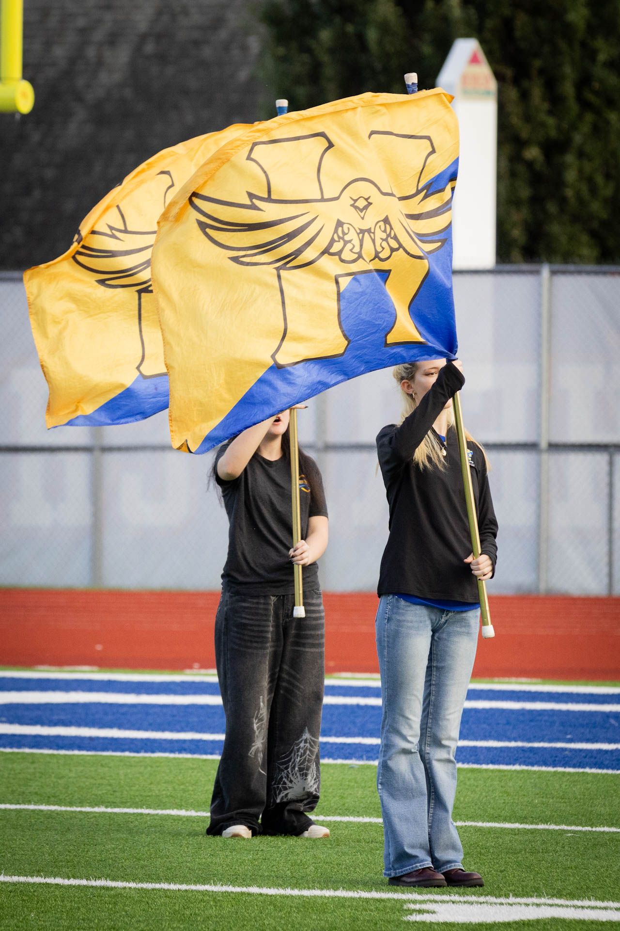 The Hutchinson High School color guard, the Marching Tigers, performs alongside the pep band. CREDIT CHARISSA GRAVES | THE HUTCHINSON TRIBUNE