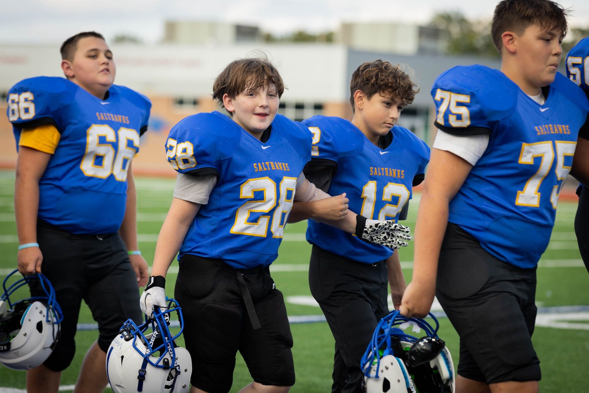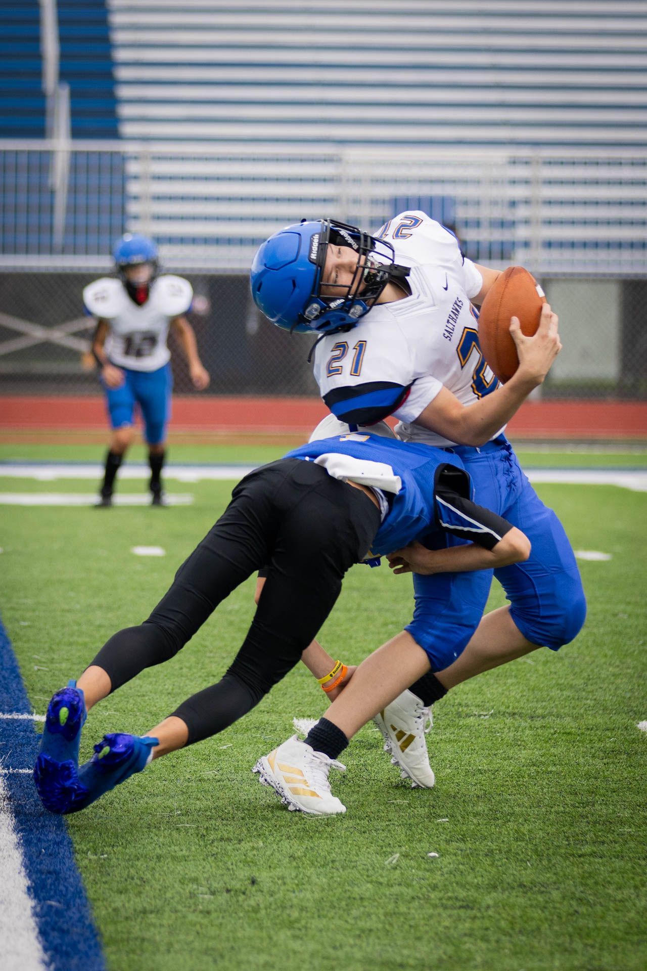Players from Hutchinson Middle School’s football team, the Salthawks, scrimmage on the field. CREDIT CHARISSA GRAVES | THE HUTCHINSON TRIBUNE