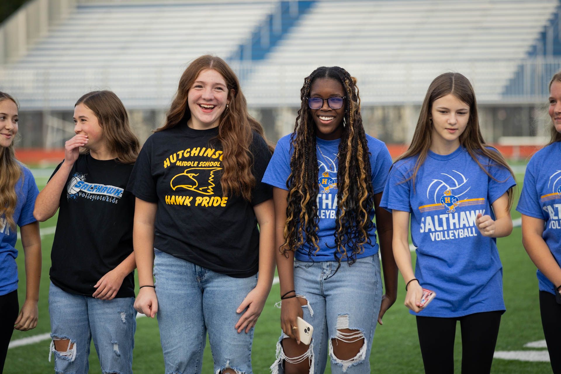 Members of the Hutchinson Middle School football team walk up for their introduction. CREDIT CHARISSA GRAVES | THE HUTCHINSON TRIBUNE