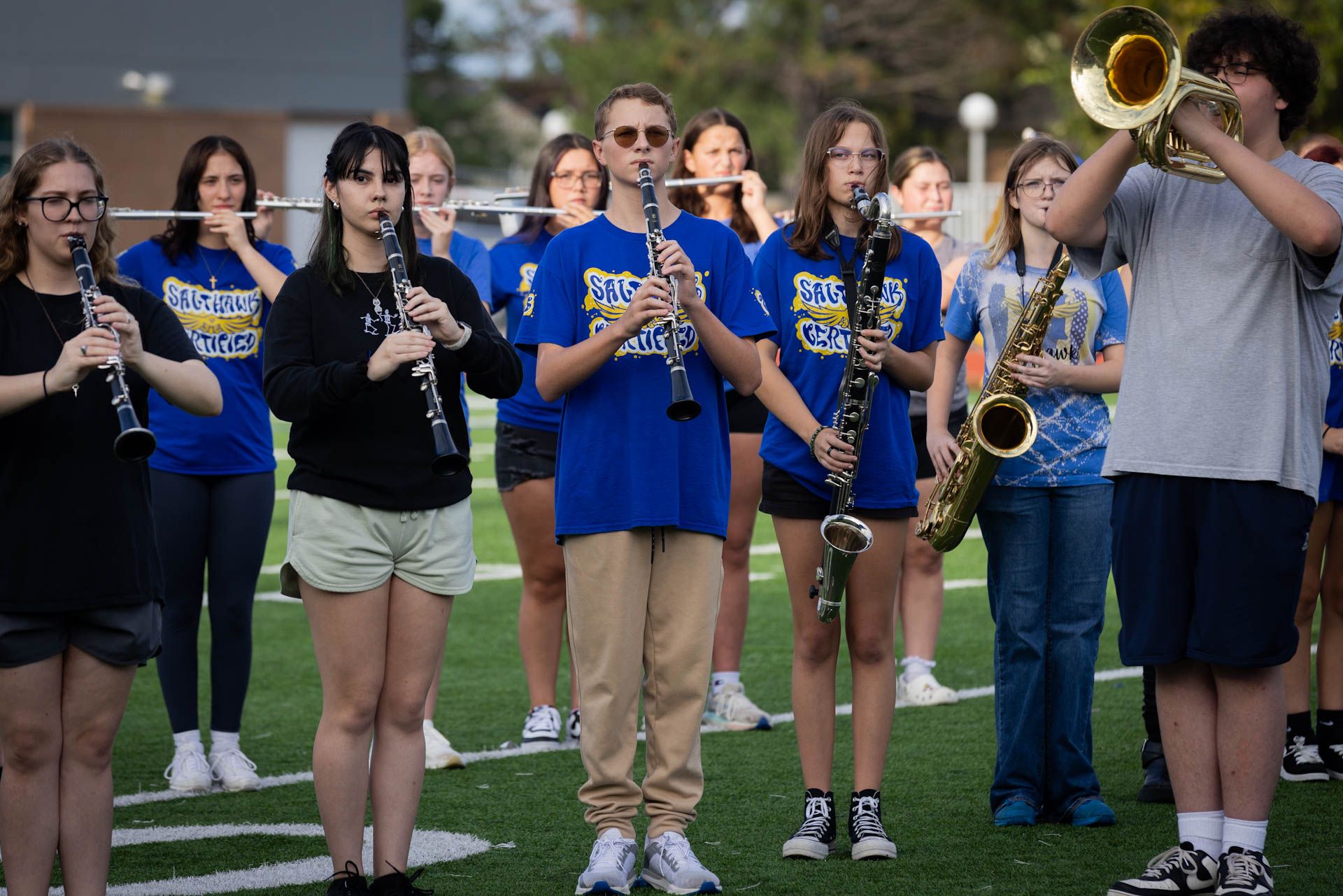 HUTCHINSON—On Friday, Aug. 29, Hutchinson High School’s (HHS) football team took the field for their annual Blue and Gold scrimmage at 7 p.m. at Gowans Stadium, introducing their and Hutchinson Middle School’s (HMS) fall sports teams. The youth football teams also scrimmaged, and there were performances by the middle and high school dance and cheer teams, as well as the HHS pep band and color guard. The event was accompanied by food trucks from Mobb Foods, Los Supreme Glizzies, and Hutch Shaved Ice in the parking lot, starting at 5:30 p.m.