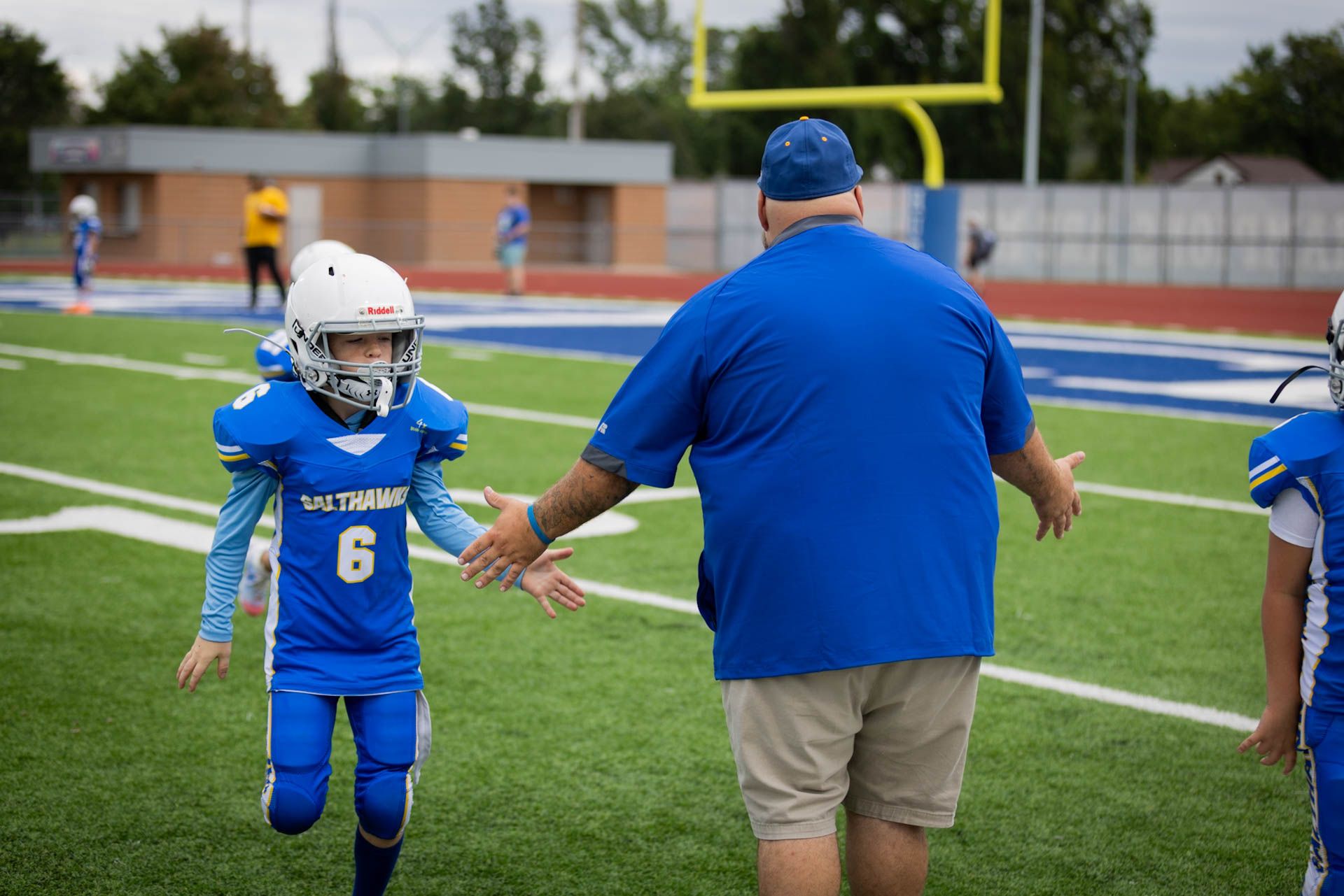A YMCA youth coach congratulates his players after their scrimmage. CREDIT CHARISSA GRAVES | THE HUTCHINSON TRIBUNE